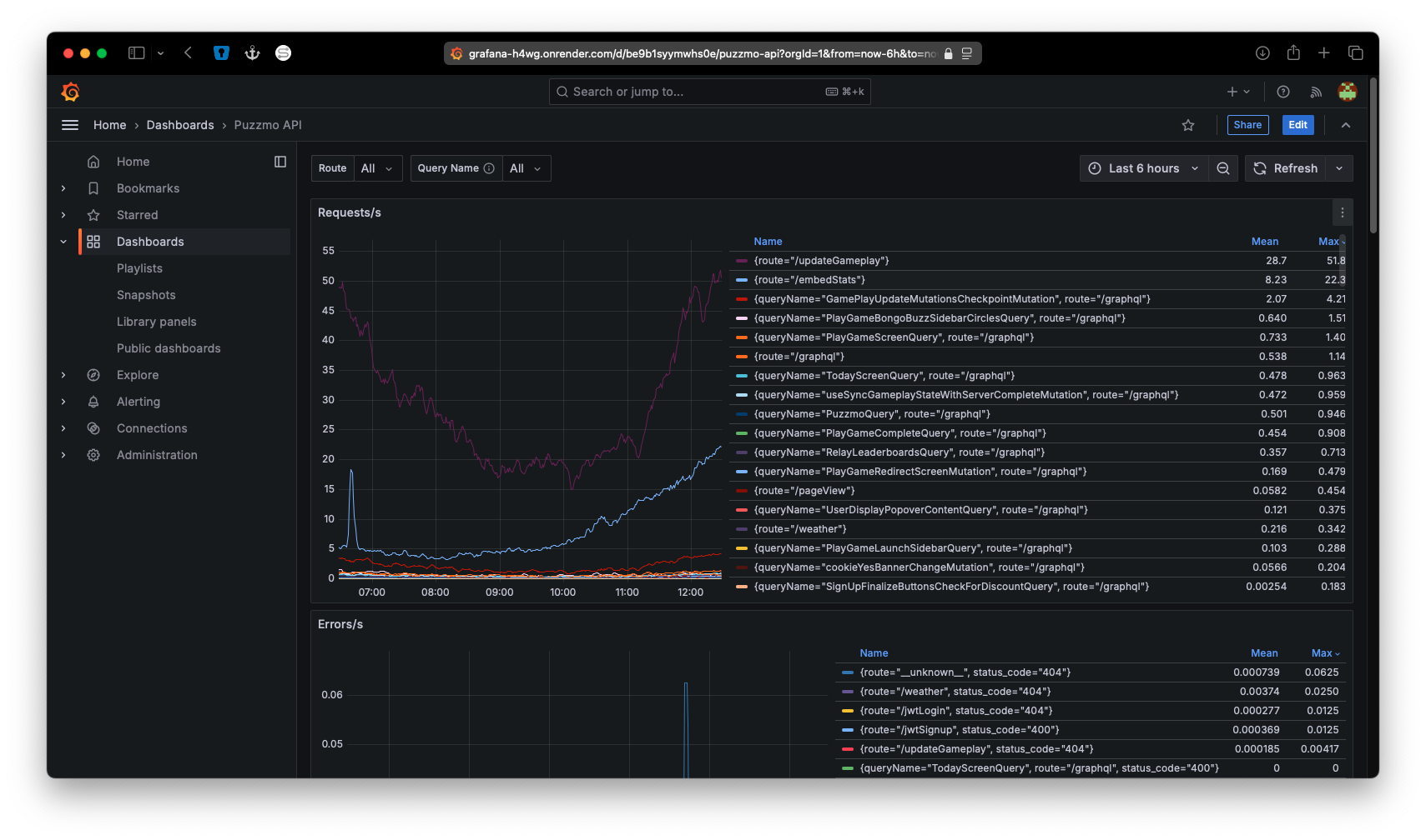 Gary wrapped up adding prometheus and grafana to the Puzzmo API two weeks ago, so now we can look at graphs like this:
